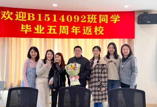 刘晓露代表B1514092班所有同学向陶庆老师献花,感谢学院及老师对自己的培养及教诲,并对学院的周到安排及热情接待表达了感激之情。大家都感慨到,学院就像是所有同学共同的大家庭,虽然因为种种原因几年未归,但是彼此心中时时都有牵挂。此次恰逢郑梦艳从美国归来,大家甚至等不及校庆,学校一开放校友返校通道就迫不及待地携亲带友返校,到了学院见到老师后如沐春风,如归己家。