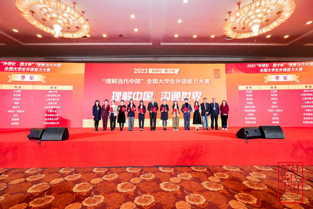 On December 7, the final of the 2023 "FLTRP-GuoCai Cup------Understanding Contemporary China" National Foreign Language Proficiency Competition for College Students (Multilingual group) took place in Beijing. He Jiahao, a postgraduate student from the German department of Class 2023, won the third place and the gold award in the German group. Zhao Jialu, an undergraudate student from the German department of Class 2020, won the silver award in the German group.